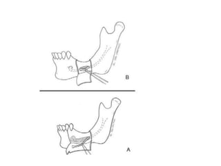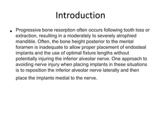 Progressive bone resorption after tooth loss can leave inadequate bone height for dental implants without risking nerve injury. This document describes a technique for repositioning the inferior alveolar nerve laterally to allow safe implant placement medial to the nerve. The procedure involves creating bone windows around the mental foramen and posteriorly, carefully retracting the nerve and placing implants. Bone graft and membranes are used to support the nerve in its new position and prevent direct contact with implants.