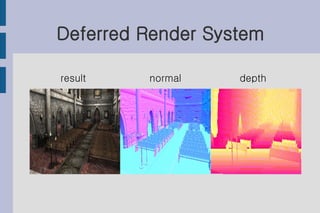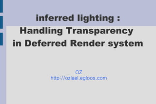 This document discusses techniques for handling transparency in a deferred rendering system. It proposes using inferred lighting, where lighting and G-buffers are rendered at a lower resolution than the final output. Transparent objects are rendered on alternating lines. Discontinuity sensitive filtering is used to upsample the lighting, grouping pixels with similar normals. Transparent pixels are given special IDs to be lit correctly during the lighting pass. While this allows rendering transparency in deferred lighting, it has limitations such as reduced resolution for transparent objects and increased cost.