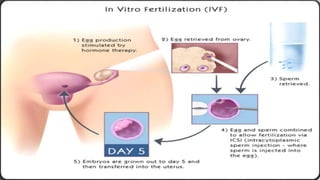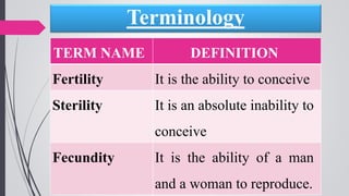 Infertility is defined as the failure to conceive after one year of unprotected intercourse. It affects around 10-15% of couples. The main causes of infertility in females are ovulation disorders (40%) and fallopian tube damage (30-40%), while in males it is poor sperm quality (30-40%). Diagnostic tests include hormone levels, ultrasound, HSG and laparoscopy. Treatment depends on the cause but may include fertility drugs, IUI, IVF or surgery. IVF involves fertilizing eggs with sperm in a lab and then transferring the embryos into the uterus.