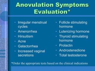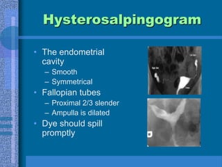 This document discusses infertility, including its definition, causes, evaluation, and treatment options. It begins by defining primary and secondary infertility and outlining the requirements for conception. Common causes of infertility for both men and women are then described. The document provides details on evaluating infertility, including medical history, physical exams, lab tests, and procedures like semen analysis and hysterosalpingography. Treatment options are covered, such as ovulation induction, surgery, assisted reproductive technologies like IUI, IVF, and surrogacy. The emotional impact of infertility is also addressed.