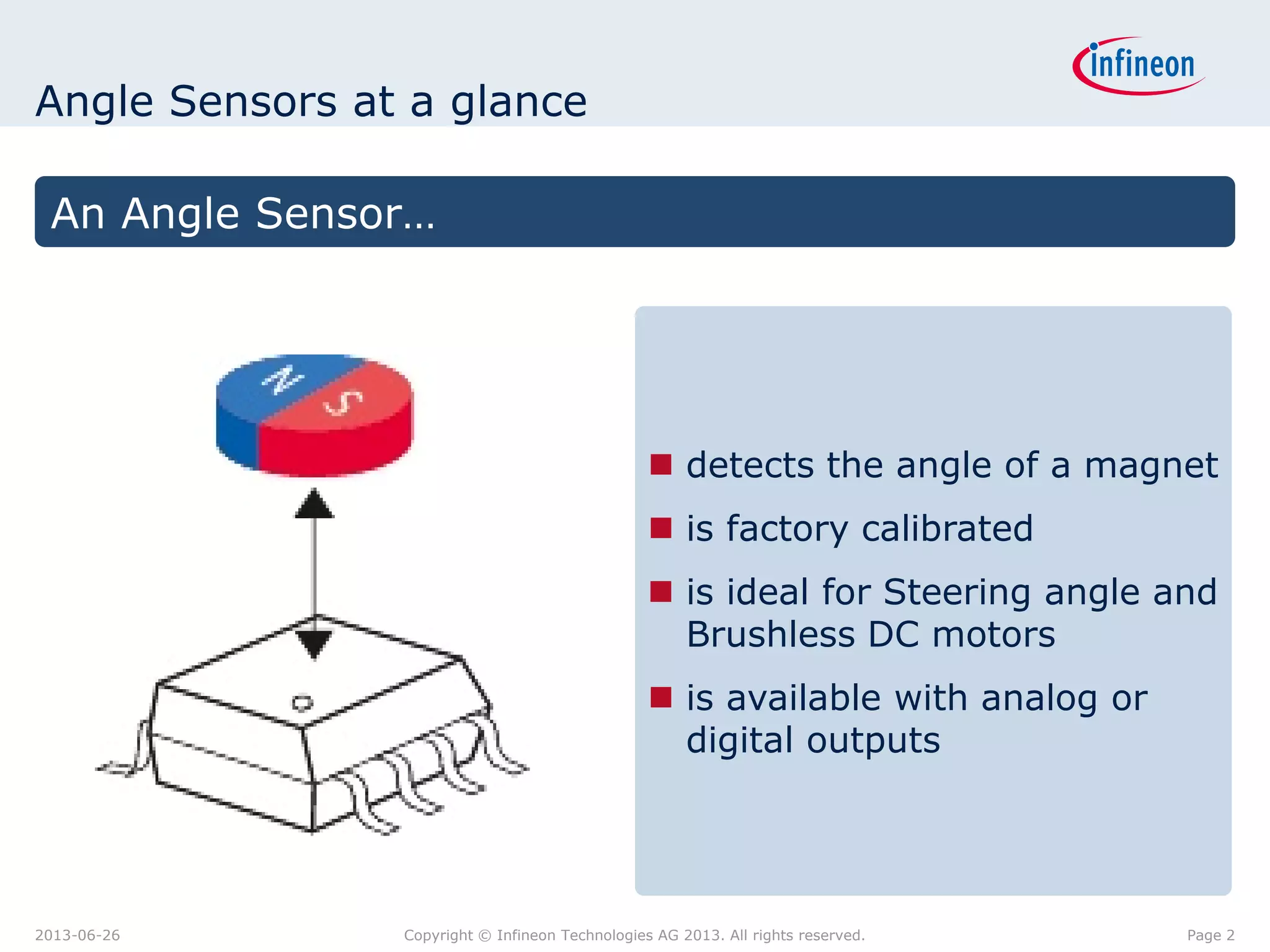 Infineon produces angle sensors for automotive applications such as steering angle detection and brushless DC motor position sensing. The sensors use integrated Magneto Resistive (ixMR) technology to detect the angle of a magnet and output either analog sine/cosine waves or digital angle values. Infineon's angle sensor portfolio includes high accuracy products calibrated to within 1 degree and offering fast update rates up to 43 microseconds for applications such as electric power steering.