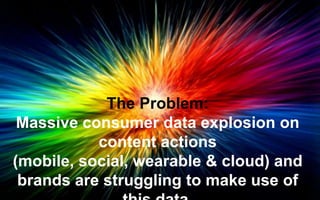 The document discusses the challenges brands face in engaging consumers amidst a data explosion, highlighting the importance of leveraging insights from consumer interactions to enhance content marketing strategies. It introduces concepts like hypercuration and content engineering, which emphasize using data to understand trends and optimize content for better consumer engagement. Key benefits include improved understanding of audience preferences, ongoing behavior tracking, and effective targeting for content distribution.