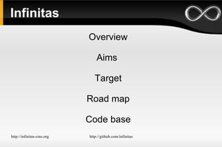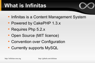 Infinitas is an open source Content Management System built with CakePHP 1.3.x that aims to provide a solid extension of the CakePHP core using its conventions and libraries. It includes features like content management, user authentication, and plugin support to provide a powerful yet customizable and easy to use CMS for developers and users. The codebase is actively developed on GitHub with over 1500 commits and the next release will focus on bugs and unit testing ahead of the 1.0 launch.