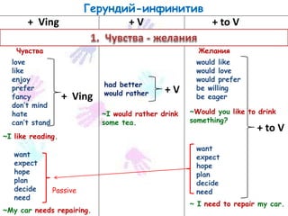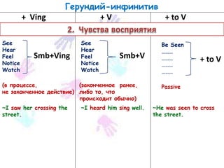 This document provides examples of gerunds and infinitives in English. It lists verbs that can be followed by a gerund or infinitive and provides short examples to illustrate the structures. It also notes some exceptions and differences in meaning between using a gerund versus an infinitive after certain verbs. The document is a reference for English grammar structures involving gerunds and infinitives.