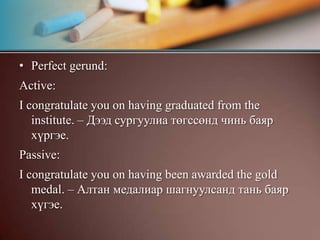 Perfect gerund:Active:I congratulateyou on having graduated from the institute. – Дээд сургуулиа төгссөнд чинь баяр хүргэе.Passive:I congratulate you on having been awarded the gold medal. – Алтан медалиар шагнуулсанд тань баяр хүгэе.