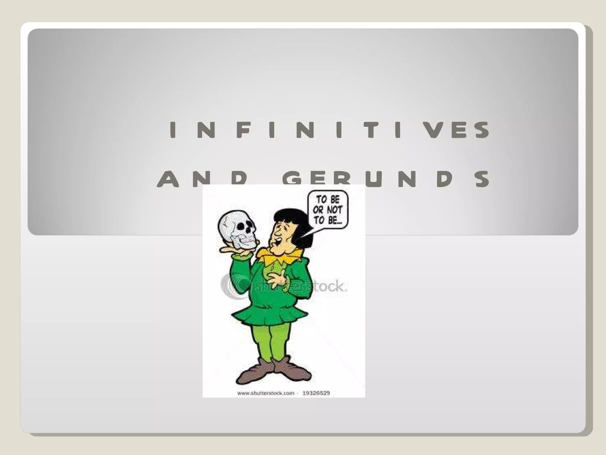 This document discusses the uses of infinitives and gerunds in English. Gerunds are used as subjects of sentences when speaking generally, and after certain verbs like "enjoy" and "avoid". Infinitives are used as subjects when referring to a specific moment, and after verbs like "decide" and "plan". Some verbs like "begin" and "prefer" can be followed by either an infinitive or gerund without a change in meaning, while other verbs like "stop" and "regret" have different meanings depending on whether they are followed by an infinitive or gerund. The document provides examples to illustrate the different uses.