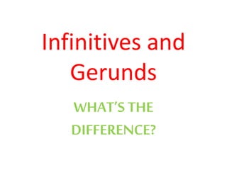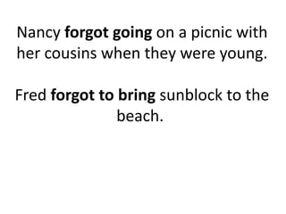 This document discusses the differences between infinitives and gerunds. Infinitives use "to" before a verb, such as "to bring" or "to rest". Gerunds end in "-ing" and can act as nouns, such as "going" or "smoking". Examples are provided of sentences using infinitives and gerunds correctly, such as "Fred forgot to bring sunblock to the beach" and "He stopped smoking for health reasons".