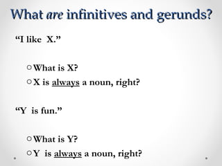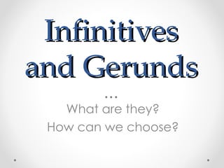 Infinitives and gerunds are verbs that are changed into nouns. Infinitives are verbs with "to" added, like "to study" or "to drink." Gerunds are verbs ending in "-ing," like "studying" or "drinking." The document provides examples of when to use infinitives and gerunds after verbs like "like" and when something "is fun." It also gives examples of common mistakes in using infinitives versus gerunds.