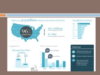 This document discusses optimizing a company's digital marketing for the mobile environment. It covers evaluating a company's mobile website and optimizing content for mobile screens. It also discusses using social media effectively on mobile platforms to engage customers and gain their permission for mobile marketing communications like text messages, emails, and apps. The goal is to provide customers with a seamless experience across all digital touchpoints and devices.