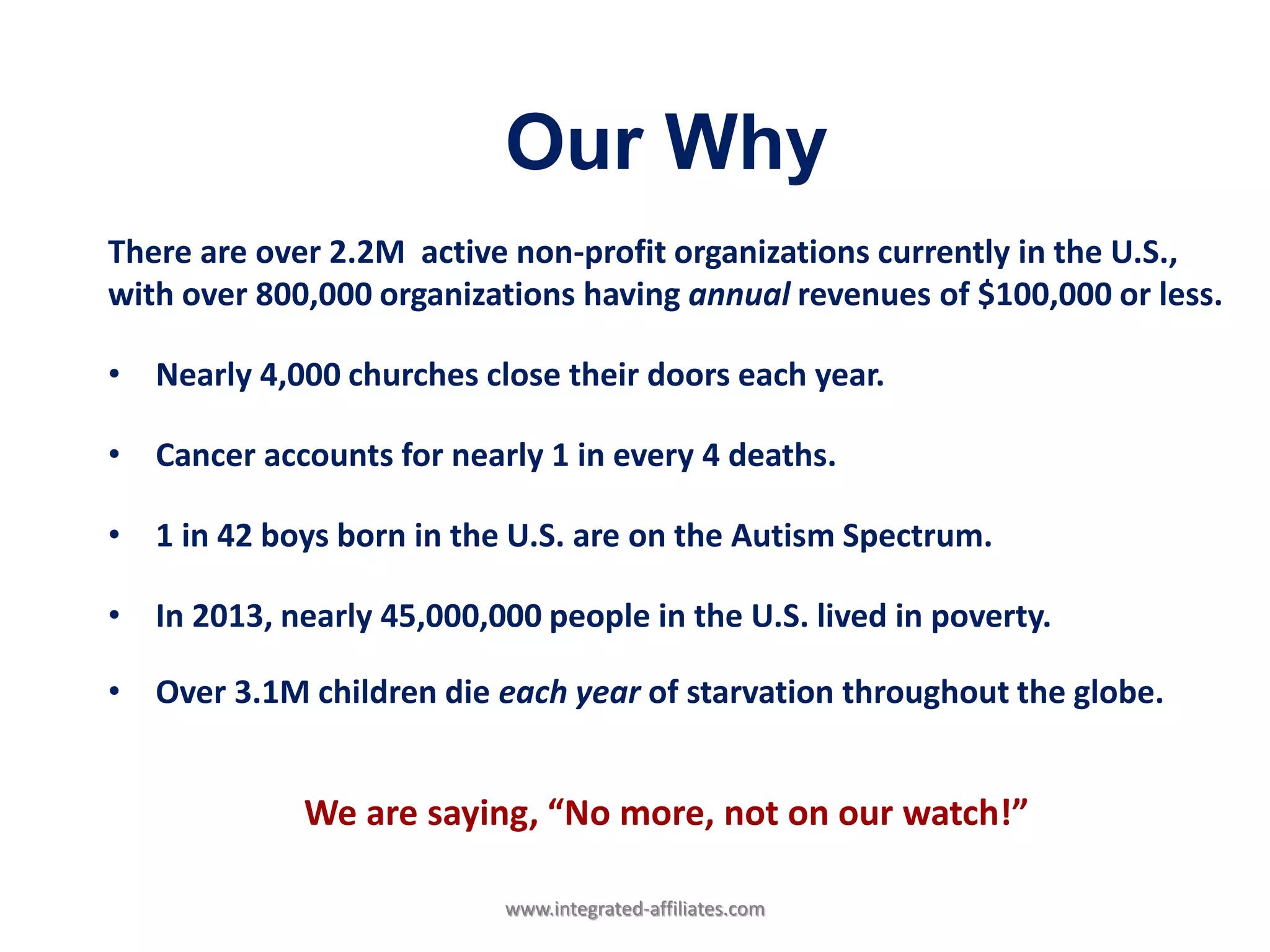 This document describes Integrated Affiliates' proprietary InfinityShare platform which helps non-profit organizations fundraise nationwide through email, social media, and text. The platform allows organizations to continue raising funds without additional resources and attract new supporters. It provides mobile-friendly fundraising pages where supporters can contribute and receive matching gift cards. Organizations earn a high percentage of contributions and can partner with Groupon to earn from supporters' purchases. The platform aims to streamline fundraising by allowing continuous fundraising throughout the year rather than periodic events.