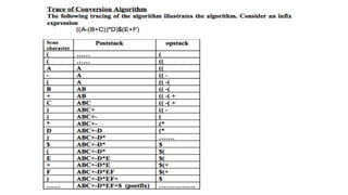 The document covers infix, postfix, and prefix notations in mathematics, explaining the order of operations and how to convert between these forms. It details the evaluation of postfix expressions using a stack and provides examples for both infix to postfix conversions and prefix evaluation. Additionally, it discusses recursion, its advantages and disadvantages, and illustrates a recursive algorithm for solving the Tower of Hanoi problem.