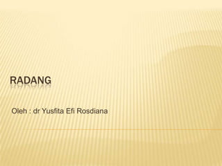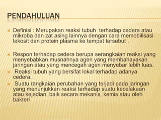 Dokumen ini menjelaskan tentang radang, yang merupakan respons tubuh terhadap cedera atau infeksi, dengan membedakan antara radang akut dan kronis serta menjelaskan mekanisme dan sel-sel yang terlibat dalam proses ini. Tanda-tanda inflamasi dan mediators kimia yang berperan dalam reaksi inflamasi juga dicakup, termasuk peran berbagai jenis leukosit. Selain itu, dibahas pula pemulihan setelah radang dan berbagai jenis radang berdasarkan gejala klinis.