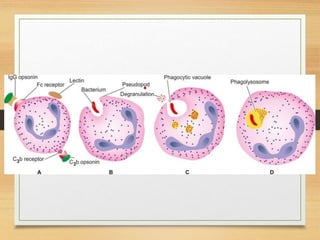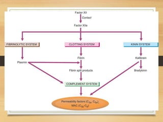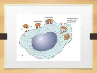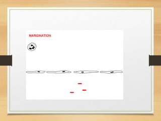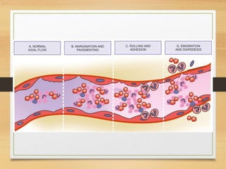 Inflammation is mediated by chemical signals that recruit leukocytes to sites of injury. Leukocytes are activated upon binding to endothelial cells or mediators and emigrate from blood vessels through a process of margination, rolling, adhesion, migration, and chemotaxis. At the injury site, leukocytes undergo phagocytosis and degranulation to engulf and kill pathogens. Mediators of inflammation include vasoactive amines, lysosomal enzymes, arachidonic acid metabolites, cytokines, oxygen radicals, nitric oxide, kinins, complement components, and coagulation/fibrinolytic factors that promote processes like vasodilation, increased permeability, chemotaxis, fever, pain, and tissue damage.