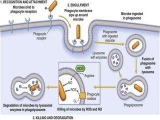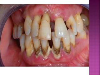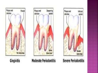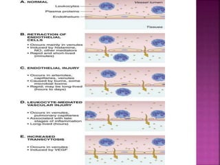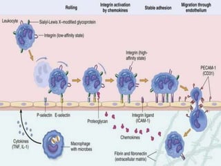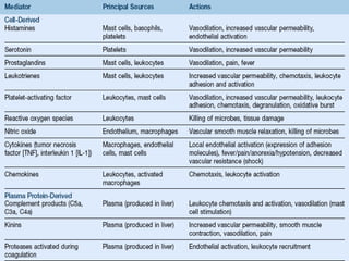 This document provides an overview of inflammation. It defines inflammation as the body's response to infection or damaged tissue where immune cells are recruited to sites of injury. The goals of inflammation are to eliminate the cause of injury and initiate repair. Common causes include infection, necrosis, and foreign bodies. Cardinal signs are redness, swelling, heat, pain, and loss of function. Acute inflammation resolves quickly while chronic inflammation persists long-term. Mediators such as histamine and cytokines regulate the inflammatory response, which involves vascular changes, cellular recruitment, and phagocytosis. Chronic inflammation can lead to fibrosis and tissue destruction. Clinical examples provided are gingivitis, periodontitis, and pulpitis.