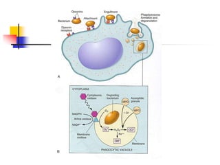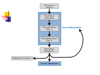 This document summarizes inflammation and the cellular responses involved. It describes inflammation as the body's protective response to injury that is interwoven with the repair process. The cardinal signs of acute inflammation are described as heat, redness, swelling, pain, and loss of function. Both acute and chronic inflammation involve vascular changes, leukocyte migration, and chemical mediators like histamine, cytokines, and arachidonic acid metabolites. Phagocytosis, granulomatous inflammation, healing, and extracellular matrix remodeling are also summarized.
