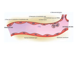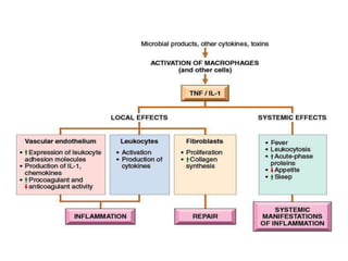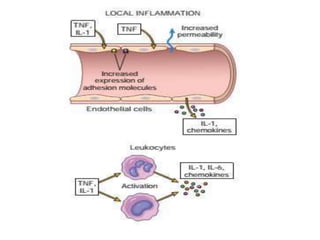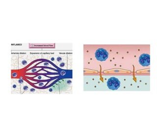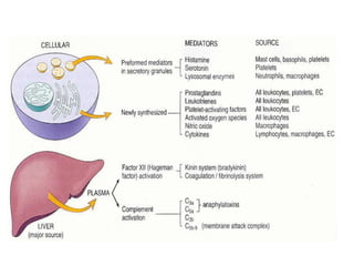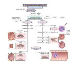 This document provides an overview of inflammation and the mediators involved. It defines inflammation and describes the causes and types. The key events of acute inflammation are discussed, including vascular changes like increased permeability and cellular events like chemotaxis and phagocytosis. Finally, it outlines several important mediator classes derived from arachidonic acid that are involved in regulating the inflammatory response, such as prostaglandins, leukotrienes, and thromboxanes. These mediators stimulate vascular and cellular reactions to initiate and propagate the inflammatory cascade.