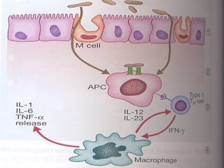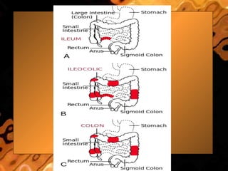 Inflammatory Bowel Disease (IBD) refers to two conditions: Crohn's disease and ulcerative colitis. Crohn's disease causes chronic inflammation of the gastrointestinal tract that can affect any location from mouth to anus in a discontinuous pattern. Ulcerative colitis causes non-granulomatous inflammation of the colon and rectum in a continuous pattern beginning in the rectum. The causes of IBD are not fully known but involve an immune reaction to environmental triggers in genetically predisposed individuals. Symptoms vary depending on the location and severity of inflammation. Management involves non-pharmacological approaches as well as medications to reduce inflammation like aminosalicates, corticosteroids, immunosuppress