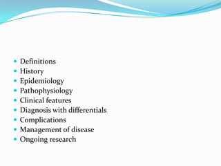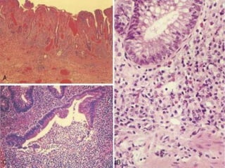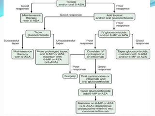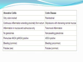 This document provides an overview of inflammatory bowel disease (IBD). It defines IBD as an idiopathic inflammatory intestinal disease resulting from inappropriate immune activation to intestinal microflora. The two main types of IBD are ulcerative colitis and Crohn's disease. The document discusses the history, epidemiology, pathophysiology, clinical features, diagnosis, complications, management, and ongoing research of IBD.