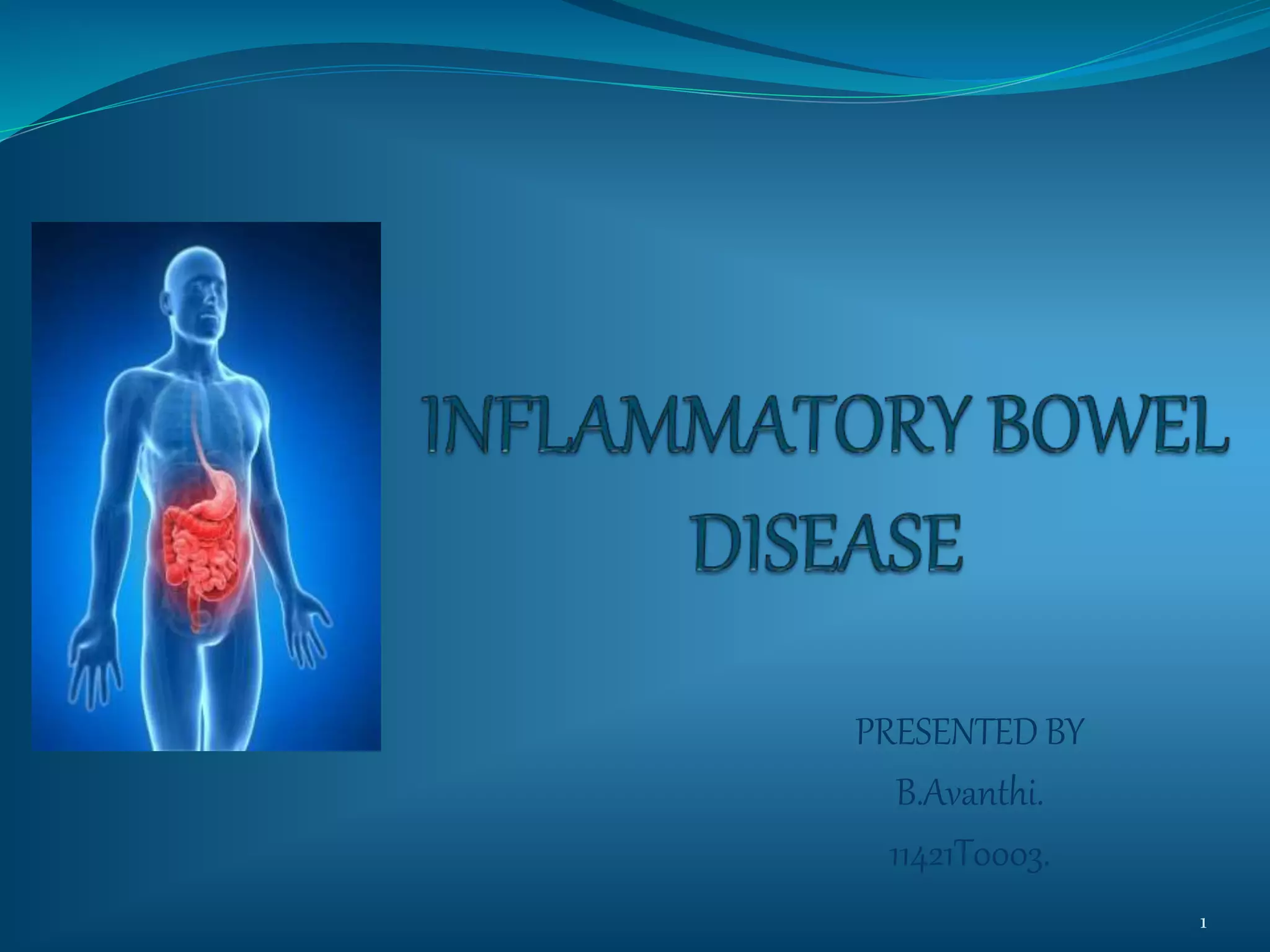 Inflammatory bowel disease (IBD) refers to ulcerative colitis and Crohn's disease, which are chronic inflammatory conditions of the gastrointestinal tract. Ulcerative colitis causes inflammation of the colon, while Crohn's disease causes transmural inflammation that can involve any part of the gastrointestinal tract from mouth to anus. The causes of IBD are not fully understood but involve genetic susceptibility, environmental factors, and dysregulation of the immune system. Symptoms vary depending on the location and severity of inflammation. Treatment involves medications to induce and maintain remission such as aminosalicylates, corticosteroids, immunomodulators, antibiotics, biologics, and surgery for complications.