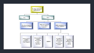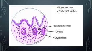 This document provides guidance on histopathological assessment of inflammatory bowel disease (IBD) biopsies. It discusses the clinical considerations and tissue sampling for IBD diagnosis. The key diagnostic categories and features of normal and abnormal mucosa are outlined. Guidance is provided on distinguishing IBD from non-IBD conditions, and distinguishing between ulcerative colitis and Crohn's disease. The effects of time and treatment on histological findings are also covered. The document recommends a standardized reporting scheme called PAID for IBD biopsy reports.