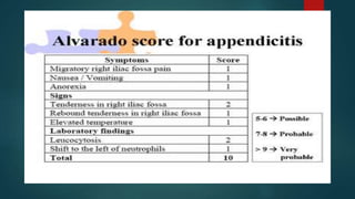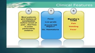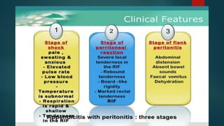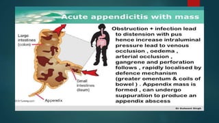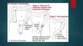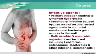 The document discusses inflammatory intestinal disorders, particularly focusing on appendicitis, peritonitis, gastroenteritis, and diverticulitis. It details the causes, risk factors, pathophysiology, clinical manifestations, diagnostic evaluations, and management approaches for each condition. Appendicitis is characterized by obstruction and inflammation of the appendix, peritonitis involves inflammation of the peritoneum due to infection, gastroenteritis is inflammation of the gastrointestinal tract leading to diarrhea and vomiting, and diverticulitis results from inflammation of diverticula in the colon.