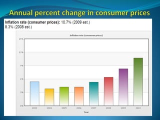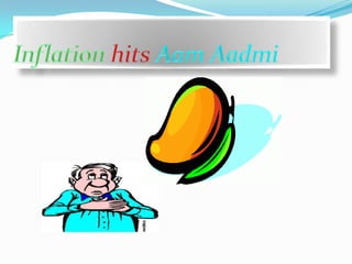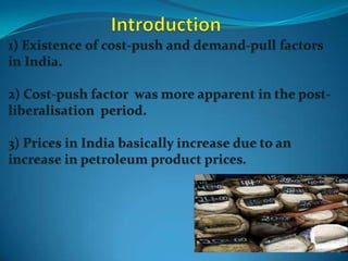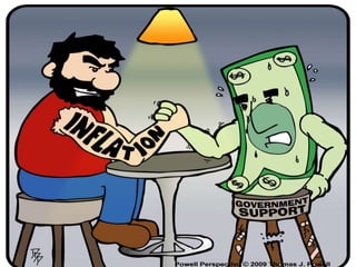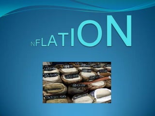 Inflation is defined as a sustained increase in the general price level in an economy over time. It can be caused by demand-pull factors, like too much money chasing too few goods, or cost-push factors like increases in production costs. Inflation is measured by changes in a consumer price index and can vary in its rate from creeping to hyperinflation. Governments use monetary and fiscal policies like controlling the money supply and public spending to combat inflation.