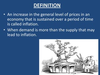 Inflation is defined as a sustained increase in the general price level in an economy over a period of time. It can be caused by demand-pull factors like excess money supply or cost-push factors like increases in production costs. There are three main types of inflation - creeping inflation (under 5%), running inflation (8-10%) and hyperinflation (double or triple digit price increases). Governments use monetary policy like increasing interest rates and fiscal policy like increasing taxes or reducing spending to control inflation. Both demand-pull and cost-push inflation impact the economy by hurting consumers and fixed income groups.