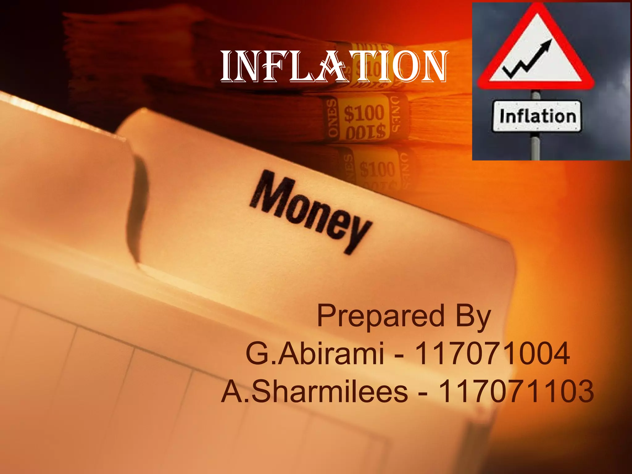 Inflation is defined as a general rise in prices over time that results in a loss of purchasing power of currency. It can be caused by an increase in the money supply or expenditures outpacing the supply of goods. In India, inflation impacts the wages of unorganized sector workers and is caused by factors like cost-push effects, demand-pull effects, and supply shocks. The types of inflation include open, suppressed, wartime, and sectoral inflation. The consequences of inflation are adverse effects on production, income distribution, development, and balance of payments. Measures to control inflation involve monetary policy, fiscal policy, increasing production, rational wage policies, and price controls.