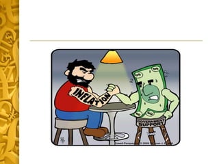 Inflation is defined as a sustained increase in the general price level of goods and services over time, which decreases the purchasing power of currency. There are three main causes of inflation: cost-push inflation occurs when business costs rise and are passed onto consumers; demand-pull inflation happens when consumer purchasing power increases, driving prices up; and money supply inflation results from increased money in circulation decreasing the value of currency. Deflation is the opposite of inflation, defined as a decrease in the general price level, and can be caused by debt deflation, lower money supply, credit contraction, or lower production costs.