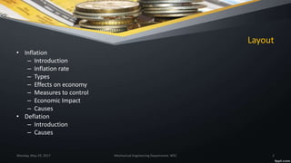 The document discusses inflation and deflation. It defines inflation as a general rise in prices over time which reduces purchasing power. The document outlines different types of inflation including wage, cost-push, pricing power, and sectoral inflation. It also discusses causes of inflation from both demand and supply sides. Deflation is defined as a general decline in prices over time. The document notes deflation can be caused by a reduction in the money supply, increased demand for money, increased supply of goods, or reduced demand for goods. Measures to control inflation include increasing production and controlling money supply, while deflation generally occurs when the supply of goods rises faster than the supply of money.
