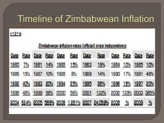 This document discusses inflation and deflation. It defines both concepts and provides types of inflation like hyperinflation. Causes of inflation and deflation are outlined. Examples of countries experiencing high inflation rates like Zimbabwe and historical hyperinflation events in Germany and Greece are examined. The costs of inflation are reviewed. Current inflation expectations and deflation challenges in Europe, Japan, and Finland are summarized. Policy options to address inflation are proposed.