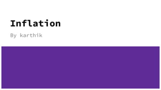 This document discusses inflation, defining it as a sustained rise in aggregate market prices. It identifies four types of inflation based on price increase rates: creeping, walking, running, and hyper. Demand-pull inflation occurs when demand exceeds supply, while cost-push inflation is due to increased production costs. Factors that can increase demand-pull inflation include population growth, money supply increases, and government spending, while cost-push factors include wage increases, taxes, and basic material prices. The effects of inflation vary among groups, with fixed-income earners hurt the most, farmers benefiting in the short-term, and producers seeing short-term gains but potential long-term losses.