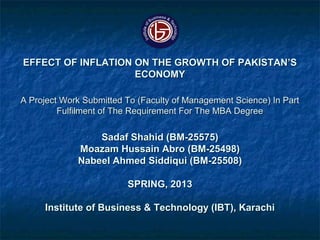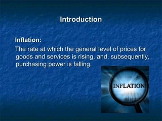 This document discusses the effect of inflation on Pakistan's economy. It defines inflation as a general and progressive increase in prices where the value of goods rises faster than the value of money. The document outlines the different types of inflation including cost-push inflation, which occurs when businesses raise prices to maintain profits in response to higher production costs, and demand-pull inflation, which arises when aggregate demand exceeds supply. The consumer price index is used to measure inflation. Some factors that can cause inflation in Pakistan are natural calamities, indirect taxes, rising import prices, and shortages in production factors. The document recommends policies like tight monetary policy, contractionary fiscal policy, and increasing domestic production to help control inflation.