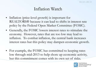 - The Federal Reserve will likely continue its low interest rate policy through mid-2013 to support economic growth, though this could increase inflation risks.
