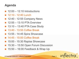 The document outlines the agenda for the 2017 Mannheim User Summit hosted by Inflectra Corporation, including presentations, showcases, and discussions about company news and product updates. It highlights new releases and features planned for their software products such as SpiraTeam, Rapise, and Kronodesk, focusing on user engagement and community building. Additionally, it discusses future development plans and training initiatives aimed at enhancing the user experience and product functionality.