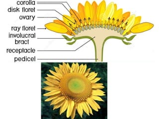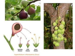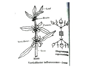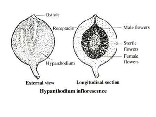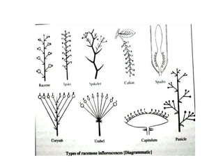 The document discusses the structure and types of inflorescence in flowering plants, including explanations of solitary and grouped flowers, the roles of peduncles, pedicels, bracts, and bracteoles. It classifies inflorescence into racemose, cymose, and special types, detailing characteristics of each type such as raceme, panicle, spike, and various cymes. Additionally, it describes the functions of different floral structures and their arrangements to attract pollinators and facilitate reproduction.