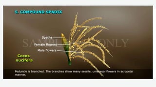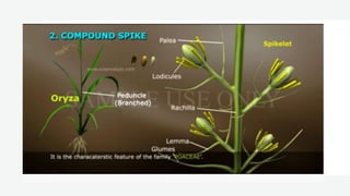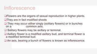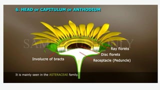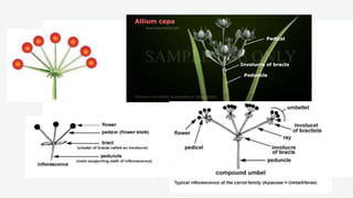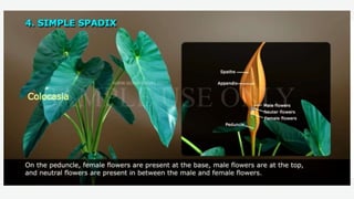 This document discusses different types of inflorescences, which are clusters of flowers on a plant. It describes eight main types of racemose inflorescences: raceme, panicle, corymb, spike, spadix, umbel, capitulum, and catkin. For each type, it provides details on the structure of the flower cluster and examples of plant species that exhibit that inflorescence type.