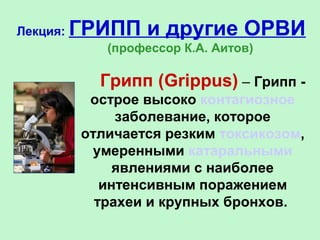Лекция профессора К.А. Аитова посвящена гриппу и другим ОРВИ как серьезной проблеме здравоохранения, подчеркивая высокую заболеваемость и экономические потери в России и мире. Описание включает исторические сведения о пандемиях, этиологию, строение вирусов гриппа A, B и C, их антигенные структуры, эпидемиологию и патогенез заболевания. Также рассматриваются симптомы и клинические проявления различных форм гриппа, а также иммунный ответ на инфекцию.