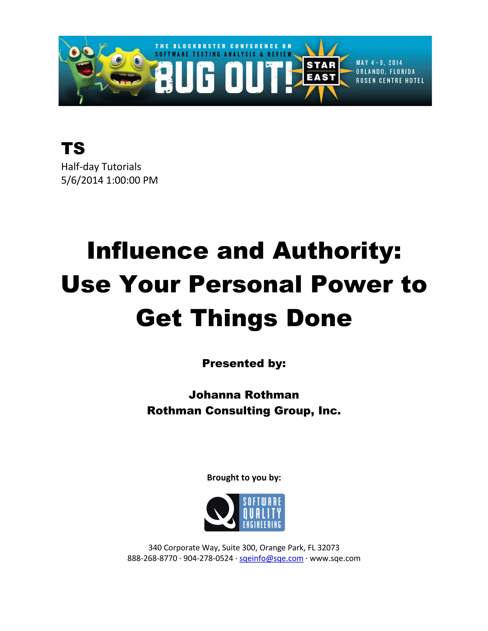 The document presents a half-day tutorial titled 'Influence and Authority: Use Your Personal Power to Get Things Done' by Johanna Rothman, focusing on improving one's influence and authority in organizational settings. Rothman emphasizes the importance of congruence in communication, building rapport, and establishing competence and trustworthiness to effectively influence others. Additionally, it addresses the role of personal power, organizational culture, and various methods to enhance influence and achieve desired outcomes.