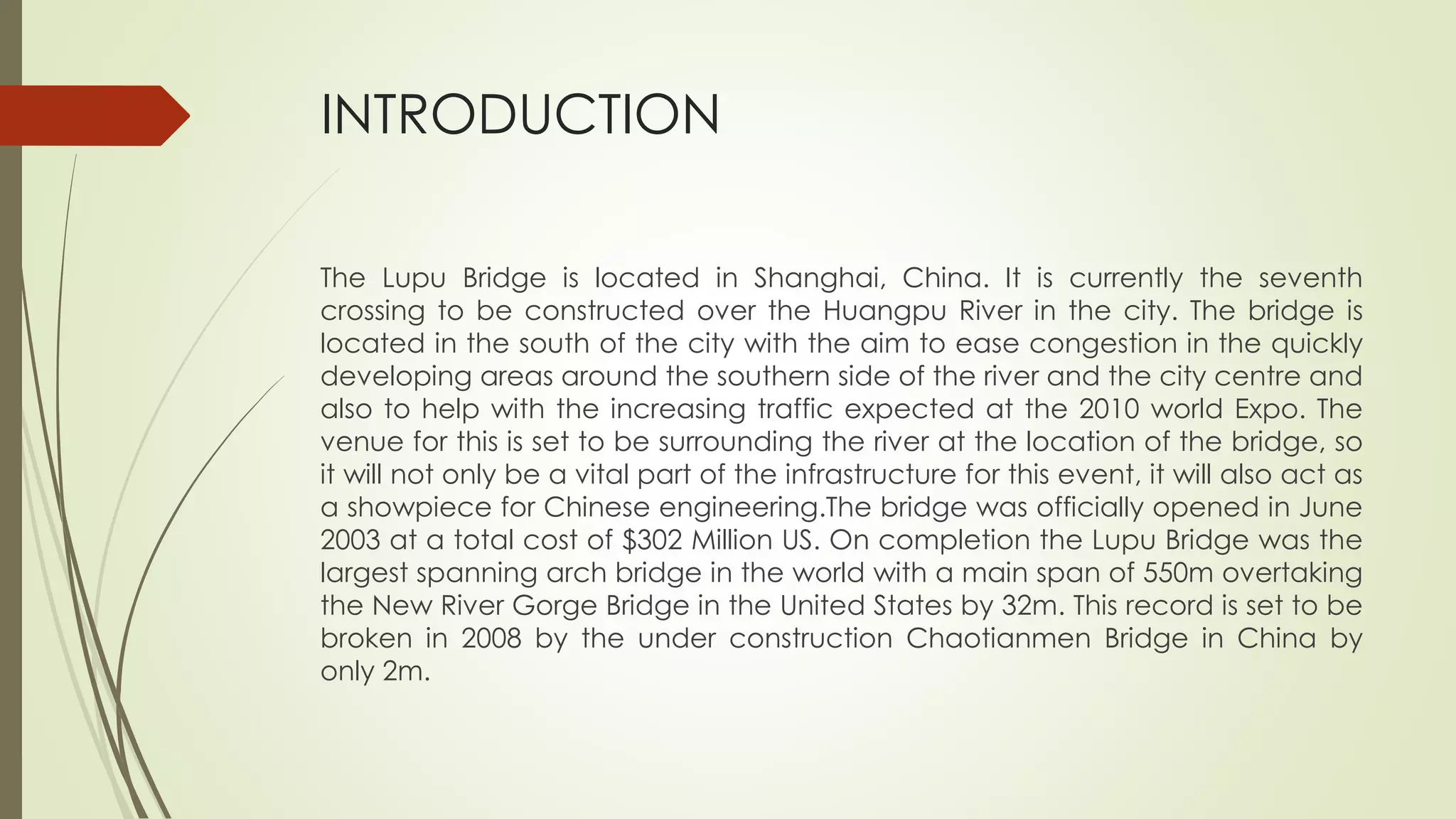 The Lupu Bridge in Shanghai, China is a steel box section tied arch bridge with a main span of 550m, making it the largest arch bridge in the world when it was completed. A tied arch bridge design was used because the ground conditions on either side of the river were unsuitable for the large forces from a normal arch bridge. The bridge was analyzed using structural analysis software to determine member forces and deformations under load. The bridge is an impressive engineering feat that helped advance Chinese bridge engineering.