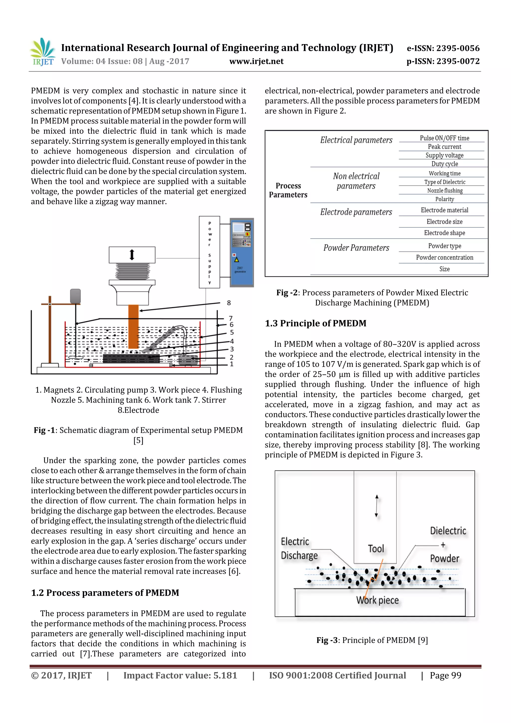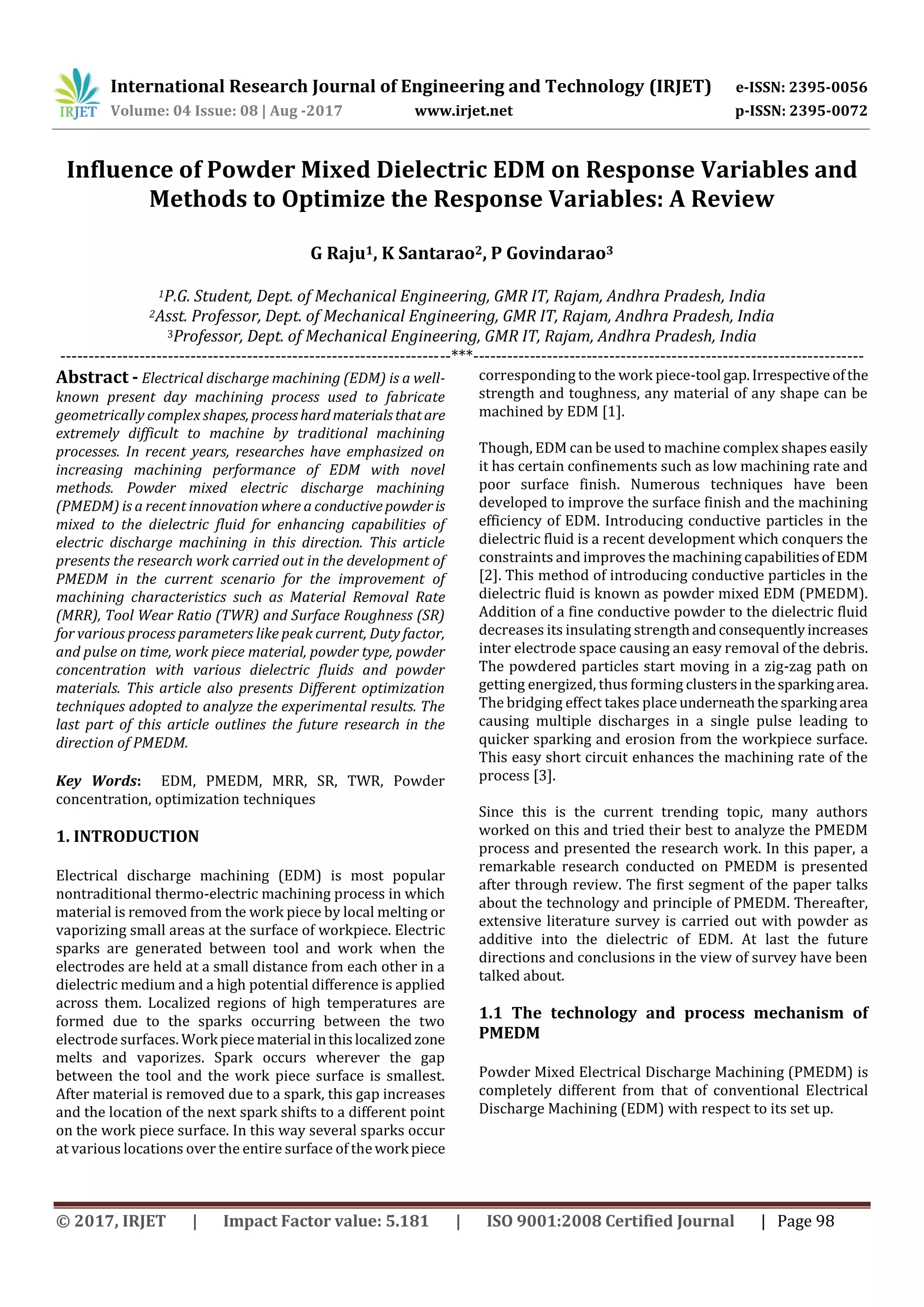 This document reviews research on powder mixed electric discharge machining (PMEDM) to improve machining characteristics like material removal rate, tool wear ratio, and surface roughness. PMEDM involves mixing conductive powder into the dielectric fluid, which decreases the fluid's insulating strength and allows for easier removal of debris during machining. The powder particles form chains between the electrodes under sparking, creating a "bridging effect" that enhances material removal. The document discusses the technology and process mechanisms of PMEDM. It then reviews literature on the effects of different process parameters and powder materials on response variables. Finally, it discusses optimization techniques like Taguchi methods and response surface methodology that have been used to analyze experimental PMEDM results.