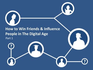 Buku 'How to Win Friends & Influence People in the Digital Age' oleh Dale Carnegie membahas cara membangun hubungan yang kuat dan pengaruh positif di era digital. Penekanan diberikan pada pentingnya mendengarkan, menyimak, dan memberikan perhatian kepada orang lain untuk menciptakan koneksi yang bermakna. Prinsip-prinsip Carnegie tetap relevan, menunjukkan bahwa membangun kepercayaan dan membuat orang lain merasa lebih baik adalah kunci untuk menjalin persahabatan yang tahan lama.