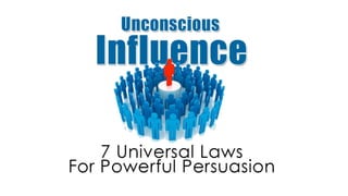 The document discusses seven laws of influence and persuasion, emphasizing the importance of being aware of how you influence others and how you can leverage these principles. Key laws include building trust and rapport, establishing authority, fostering commitment, utilizing social proof, understanding contrast, employing reciprocity, and creating a sense of scarcity. The document encourages individuals to actively apply these laws to enhance their persuasive abilities and influence in various contexts.