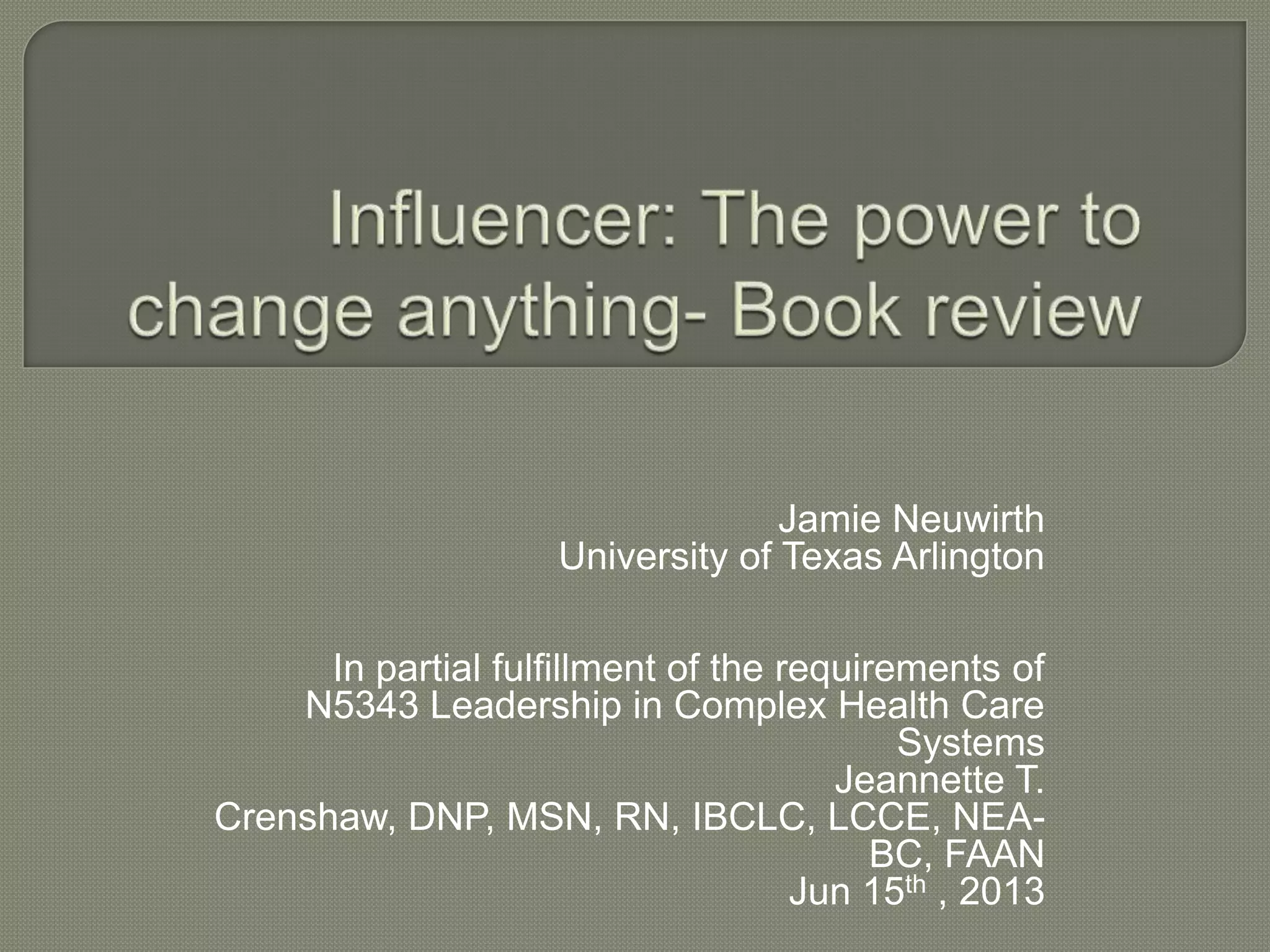 The document summarizes the book "Influencer: The Power to Change Anything" by Kerry Patterson, Joseph Grenny, David Maxfield, Ron McMillan, and Al Switzler. The book teaches effective theories and strategies for influencing positive behavioral change in organizations and individuals. It aims to show leaders and parents how to successfully implement changes while minimizing failure and resistance to change.