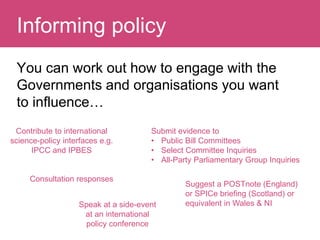 This document discusses various ways that researchers can inform and influence policy. It begins by outlining some established channels for submitting evidence to policymaking bodies, such as public bill committees and select committee inquiries. It then poses some questions about whether researchers should simply make their evidence available or try to more proactively target and communicate it to relevant policy teams. The rest of the document explores some pros and cons of both informing and influencing policy, and discusses some principles of effective policy influencing like understanding processes, building relationships, and reflecting on what works.