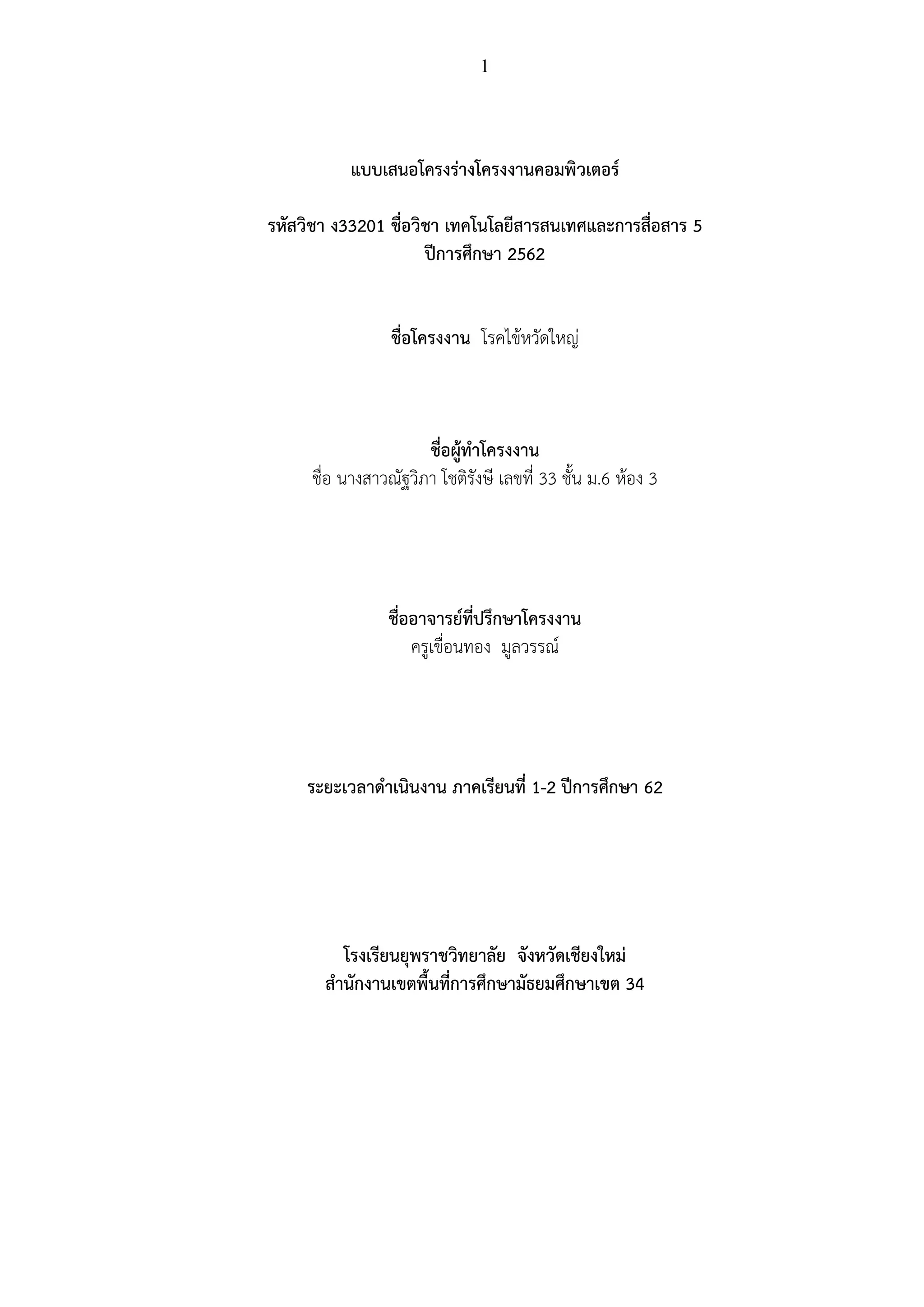 เทคโนโลยีสารสนเทศและการสื่อสาร 5 ปีการศึกษา 2562 ชื่อโครงงาน โรคไข้หวัดใหญ่ ชื่อผู้ทาโครงงาน ชื่อ นางสาวณัฐวิภา โชติรังษี เลขที่ 33 ชั้น ม.6 ห้อง 3 ชื่ออาจารย์ที่ปรึกษาโครงงาน ครูเขื่อนทอง มูลวรรณ์ ระยะเวลาดาเนินงาน ภาคเรียนที่ 1-2 ปีการศึกษา 62 โรงเรียนยุพราชวิทยาลัย จังหวัดเชียงใหม่ สานักงานเขตพื้นที่การศึกษามัธยมศึกษาเขต 34
