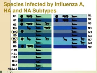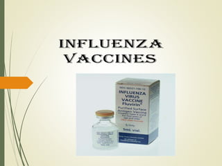 The document discusses influenza, also known as seasonal flu. It is an acute respiratory infection caused by influenza viruses that causes symptoms like fever, cough, and muscle pain. Influenza occurs seasonally as well as sporadically, and can sometimes cause pandemics every 10-40 years when the virus undergoes major antigenic changes. Influenza viruses are classified into types A, B, and C. Type A is responsible for epidemics and pandemics. The document outlines the epidemiology, transmission, clinical features, diagnosis, treatment and prevention of influenza. Vaccination is recommended for high-risk groups to reduce complications.