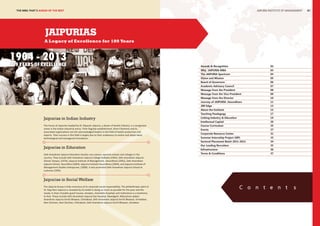 Jaipuria Institute of Management in Ghaziabad provides an MBA program. It is located in Vasundhara, Ghaziabad and is approved by AICTE and affiliated with Uttar Pradesh Technical University in Lucknow. The document includes information about the institute's address, contact details, website and social media links. It also lists the institute's vision, mission and objectives.
