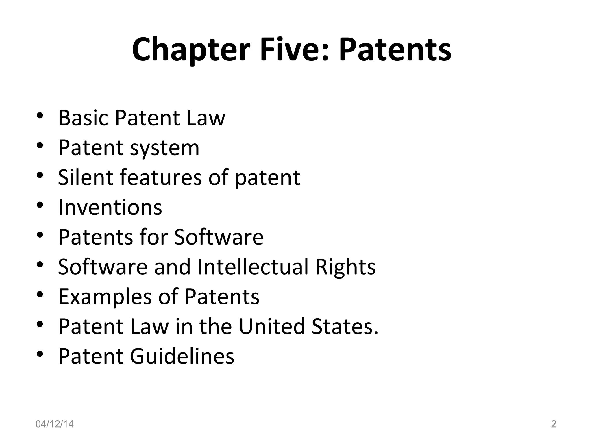 This document discusses patents and intellectual property. It covers basic patent law, the patent system, types of patents including utility patents, design patents and plant patents. It discusses requirements for patents including that inventions must be novel, useful and non-obvious. It provides examples of patented inventions and discusses patent law in the United States. It also discusses patents for software and intellectual property rights as they relate to software.