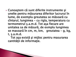 Documentul explică diverse unități de măsură pentru cantitatea de informație, dintre care cea mai mică este bitul. Fiecare caracter text este reprezentat de 8 biți, iar unitățile mai mari, precum kilobit, megabit și gigabit, sunt calculate pe baza acestuia. De asemenea, sunt prezentate echivalentele între octeți și biți.